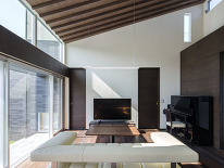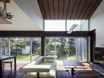 静かな住宅街のゆとりある大きな敷地.既存の樹木を多く残して,大きな開口により光と庭の緑を室内に取り込みます。
